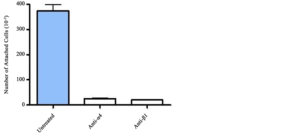 Integrin a4b1 Mediates Osteosarcoma Cell Adhesion onto a BIGH3 Substratum. Solid-phase cell adhesion assays were used to test directly and immunologically for integrins involved in osteosarcoma cell interaction with BIGH3. When seeded onto a BIGH3 substratum approximately 75% of the added osteosarcoma cells attached and spread within 90 minutes at 37˚C (Figure 9 Untreated). MG-63 cells express the integrin subunits a2, a3, a4, a5, a6 and b1 [39] . To determine whether these integrin types mediate adhesion of osteosarcoma cells to BIGH3, a set of corresponding function-perturbing anti-integrin antibodies were tested. Preincubation of cells with anti-a4 antibody, and anti-b1 antibody, significantly reduced attachment of osteosarcoma cells by 92% and 93% respectively (Figure 9 Anti-a4 and Anti-b1, P < 0.01). Other anti-integrin antibodies did not achieve statistical significance. These data indicate that a4b1 integrin mediates MG-63 cell adhesion onto a BIGH3 substratum. Extending this observation, we hypothesized that a4b1 integrin promotes osteosarcoma cell MTS formation. This hypothesis was tested using the exact paradigm to generate MTS in the presence of a4 and b1 antibodies. Unexpectedly, anti-a4 and anti-b1 antibodies did not block the antagonistic effect of BIGH3 on MTS formation, indicating the BIGH3-me-