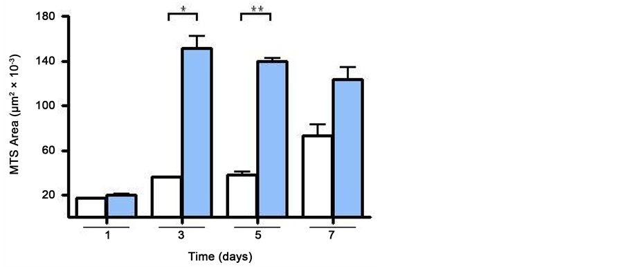 Figure 3. BIGH3 decreases the surface area of osteosarcoma cell MTS. The average two- dimensional surface area of MTS was quantified at days 1, 3, 5, and 7. At day 3 the contiguous MTS surface areas formed in the presence of exogenous BIGH3 (white columns) was significantly less than the surface area of non-treated MTS (blue columns). A statistically significant difference from the control group was achieved at days 3 and 5 (P ≤ 0.02 and 0.007, respectively) as determined by the Mann-Whitney U test. Differences did not achieve significance at days 1 or 7, n = 18.