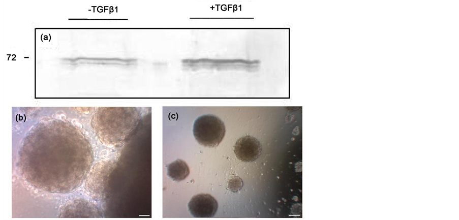 TGFb1 Promotes Development of Small MTS. With little, if any TGFb1 stimulus MG-63 cells synthesize BIGH3, however, the quantity is insufficient to antagonize formation of large MTS. To determine whether the failure of non-treated cells to form large MTS was related to the quantity of BIGH3 protein in the MTS environment, we used the cytokine TGFb1 that up regulates expression of the gene TGFBI, which encodes BIGH3 [11] . Since exogenous BIGH3 itself was sufficient to block development of large MTS phenotype, we reasoned that excluding exogenous BIGH3 from the MTS culture, and adding exogenous TGFb1 only, would result in an increase in BIGH3 protein synthesis and block development of large MTS. Real-time PCR and Western blot analyses show that TGFb1-treated spheroids synthesize a greater quantity of BIGH3 transcripts and protein relative to non-treated spheroids. SB-431542, a small chemical inhibitor of TGFβ1 receptor signaling blocked the increase in TGF-β1-induced BIGH3 expression (Figure 4(a) and Figure 4(b)). The inhibitor SB-431542 lowered BIGH3 protein in the MTS itself and in the MTS medium conditioned (Figure 4(c) and Figure 4(d)). Although non-treated MTS synthesized BIGH3 large MTS formed (Figure 5(a) and Figure 5(b)). The TGFβ1-treated MTS synthesized a greater quantity of BIGH3 that was sufficient to block development of large MTS so that small MTS only developed (Figure 5(a) and Figure 5(c)). This result too implicates TGFb1 and its activated receptor, and BIGH3 synthesis and secretion in the antagonistic pathway.