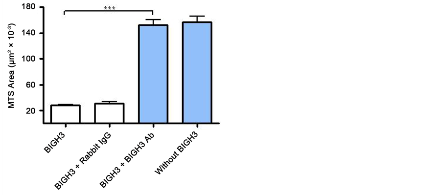 Anti-BIGH3 Antibody Blocks BIGH3’s Antagonism. BIGH3 was pre-incubated with anti-BIGH3 antibody prior to adding to osteosarcoma cells in the MTS model system. Quantifying the average MTS area in treated and non-treated conditions demonstrated that anti-BIGH3 antibody significantly prevented the antagonistic effect of BIGH3 on the formation of large MTS. Osteosarcoma cells in medium containing exogenous BIGH3 (without BIGH3 antibody) formed small MTS only (Figure 6, BIGH3). A non- related control antibody did not block BIGH3’s antagonistic effect on large MTS formation (Figure 6, BIGH3+Rabbit IgG). In contrast, an anti-BIGH3 antibody blocked BIGH3’s antagonistic effect resulting in development of large MTS (Figure 6, BIGH3 + BIGH3 Ab). There was little if any difference in the large MTS areas that developed with BIGH3 antibody when compared to non-treated MTS (Figure 6, Without BIGH3). These results again indicate that BIGH3 protein itself is sufficient to suppress large MTS formation.