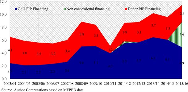 Government is increasingly using its own resources to finance public investments. Government financing of public investments has increased from an average of 3.5 percent of GDP (2004/05-2009/10) to 5.4 percent of GDP in the last six years (Figure 16). Conversely, donor financing (excluding non-concessional loans) has reduced from 3.4 percent of GDP to 2.9 percent in the corresponding period. The use of non-concessional financing (NCB) has increased particularly planned for FY2015/16. This NCB financing also increases government’s autonomy over use of PIP resources in addition to own resources. The increased use of GoU’s own resources and NCB for PIP has increased government’s autonomy to select, appraise, manage and evaluate PIP projects has increased. As such, the success and efficiency of Uganda’s public investments will depend on GoU’s PIM capacity.