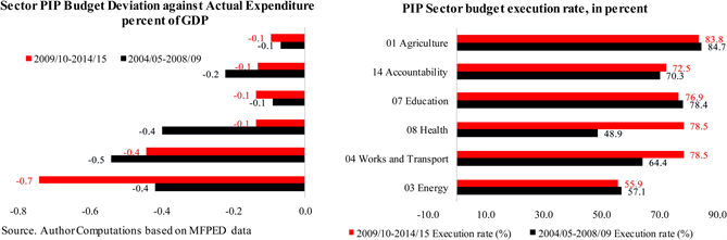 Despite increasing Energy sector PIP budget allocation (Figure 19, left), public investment projects’ execution has somewhat deteriorated in the sector from an average of 57.1 percent in FY2004/05-FY2008/09 period to 56 percent in the last six years (Figure 19, right). This has worsened the sector budget deviation from a short fall of 0.4 percent of GDP to 0.7 percent in the corresponding period. Further, while Transport sector has recorded some improvements in the execution rate, at an average of 79 percent execution rate in the last six years (FY2009/10-FY2014/15), the sector is still registering weak PIP execution. Over the last decade, the infrastructure sector (Energy and Transport sectors) contributed on average about 1 pp of GDP shortfall in PIP fiscal objectives. This weak execution points to PIM capacity gaps to select, prepare, budget, appraise, source financing and evaluate infrastructure projects. This has ramifications for overall GoU/NDP prioritization and frontloading of infrastructure projects. In that, in order to ensure efficiency of public investments that are necessary to unlock Uganda’s economic potential, it is crucial to strengthen Uganda’s PIM capacity.