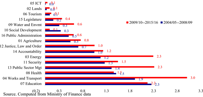 Infrastructure sectors (Works and Transport and Energy sectors combined) take the largest share of total budget and this share has significantly increased in the last seven years. Works and Transport sector takes the largest budget and this share has increased from an average of 1.9 percent of GDP in 2004/05-2008/09 period to 3 percent in the past seven five years (Figure 3). Also, the energy and mineral sector’s which prior to the last seven years was lagging behind Education, Health, Public Sector Management, and Security sectors, has risen in