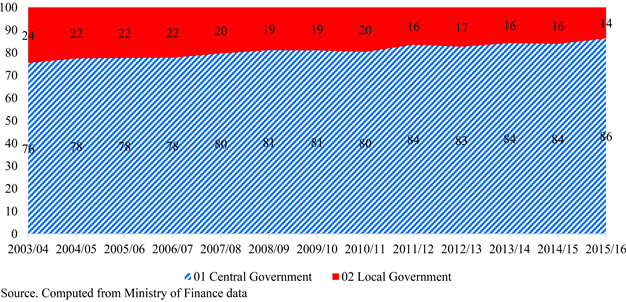 Figure 4. Budget Allocation (less interest payments) between Central and Local Government (2003/04-2015/16).