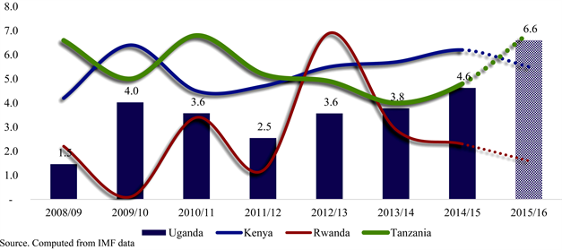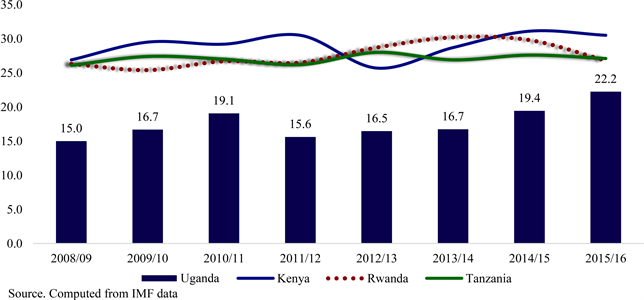The fiscal policy is becoming more expansionary and in 2015/16 budget it outpaced EAC comparator states. After Rwanda, Uganda’s fiscal deficit averaging 3.4 percent of GDP (in 2008/06-2014/15 period) was second lowest in the EAC region (Figure 6). At 5.3 percent of GDP in the corresponding period, Kenya and Tanzania had higher fiscal deficits. Nevertheless, at a projected 6.6 percent of GDP in 2015/16 budget, Uganda’s fiscal stance has been expansionary only second to Tanzania (at 6.9 percent). This expansionary fiscal stance is consistent with ramped up public investments that are expected to bridge the infrastructure deficit in roads and hydroelectricity projects.