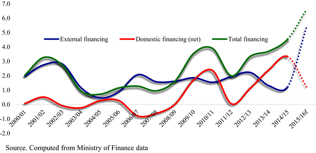 The deficit was financed through a combination of domestic and external borrowing. However, except for 2015/16, domestic borrowing has become important in recent years, as external financing has remained largely unchanged averaging 1.7 percent of GDP in the last four years preceding 2015/16. In 2015/16, the mix of external financing has significantly changed as at 4.1 percent of GDP non-concessional borrowing is expected to finance a larger component of the deficit (Figure 8).