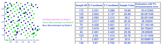 As expected, OK with no nugget-effect (Figure 12-left) produces the least smoothing effect of the three linear spatial estimations, an outcome not followed by Model 3 (Figure 12-right). Yet, it is noteworthy that both these interpolation versions are the ones that achieve the best results when a cross-validation procedure takes place (Figure 13-left). At last, if measurement error of the sampling is added to each sample (Figure 13-right) and, unsurprisingly, OK becomes a non-exact interpolator in the sense that the interpolation and the sample value are not equal (Negreiros, 2017).