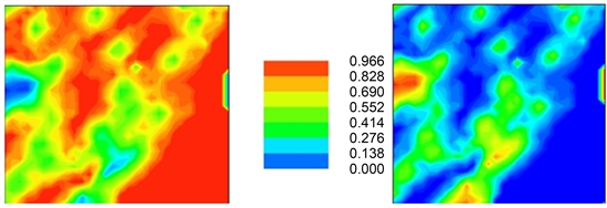 Red color signifies high lack of estimation confidence (low trust) which means that the researcher should consider these sub-areas as the future candidates for further sampling measurements. Dark blue means low instability (high certainty) regarding spatial estimation (the smaller the entropy at (X, Y) location, the greater certainty associated with that location).