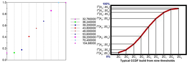 For reference, the cumulative distribution function F(x) is defined as the probability that all values in a random vector X are less than or equal to the corresponding values of vector x, that is, Prob(X ≤ x). Hence, this function (Figure 18) is monotone increasing, right-continuous while its range varies between zero and one (Negreiros, Aguilar, & Aguilar, 2012). One of the interesting features of IK is that ccdf can take very different shapes from place to place (working as a local uncertainty measure).