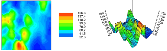 The resulting interpolation map of Figure 14 shows the probability of falling below (2D and 3D layout mapping) or exceeding (Figure 15) the chosen 48 mg/kg threshold by transforming the continuous variable into a (binary) indicator one (Figure 16 and Figure 17 shows this same logic but based on a threshold of 70 mg/kg). For computation purposes, it assumes an unknown mean while the phenomenon is considered continuous in space. Statistically, IK provides a least square estimate of the conditional cumulative distribution function (CCDF) at any cutoff. Thus, the ccdf for any location can be built by assembling the IK system for several cutoffs (Cressie, 1993).