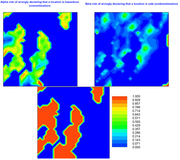 Many investigations lead to important decisions being made such as cleaning hazardous areas or correcting soil deficiencies. There is a risk of declaring contaminated a safe location (false positive or Type I Alpha risk) for a specific cutoff. Conversely, one might declare safe a contaminated location (false negative or Type II Beta risk). These two misclassification risks can be assessed from the ccdf model, according to the following math guidelines (Goovaerts, 1997):