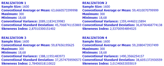 Figure 24. Four realizations of the spatial distribution of lead (Pb) contamination values over the Swiss Jura region. Curiously, the descriptive statistics of each realization (bottom) is quite similar. (Although not shown here, the variogram structure would have similar characteristics, too).