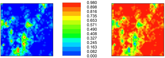 The map on the left in Figure 26 highlights the probability of the ten realizations being greater than 400 mg/kg (a highly dangerous area for any type of living organism). Computationally, if two or six out of the ten realizations (for a particular location) hold a value greater than the chosen threshold, for instance, then the probability assigned becomes 0.2 and 0.6, respectively.