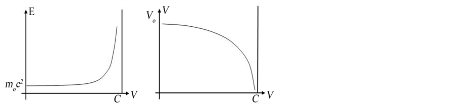 where Vo is the proper volume of the body. An examination of the Equations (1) and (3) shows that when v → c, E → ¥; and V → 0. Thus as the velocity of a body, as a quasar, increases toward the velocity of light in the empty space, the quasars’ total energy increases toward infinity and its volume or size decreases toward zero. Since it is absurd for any quasar with finite proper mass mo to have infinite energy, and at the same time volume zero, it must conclude that it is impossible for any quasar to move with the light velocity in vacuum. Nevertheless, the relativistic transformation Equations (1) and (3) show that in one case an increase of the total energy, and in the other case a decrease in the size of quasars are produced when their velocity v goes toward c, in such a way that taking into account their great red shifts; those conclusions are enough to explain the quasars’ large luminosity, and at the same time its small size; as it is easy to see in the following graphics (see Figure 1).