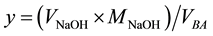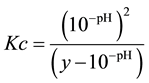 where VNaOH, MNaOH, and VBA are respectively; volume of sodium hydroxide per liter, molarity of sodium hydroxide per mol/L, and volume of benzoic acid sample per liter. Table 2 contains values of y, 10−pH, Kc, and ionic strength for each benzoic acid solution at 25˚C. Figure 1 shows the plot of (logKc) as the y-axis versus