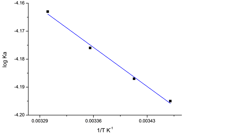 Figure 4 shows the plot of Equation (15) for benzoic acid in water at the temperature range between 16˚C and 30˚C. A linear least-squares analysis of logKa vs. 1/T data illustrates a linear relationship (r2 = 0.99237) and gave the following results for the standard values of the thermodynamic parameters for the dissociation of benzoic acid in water: