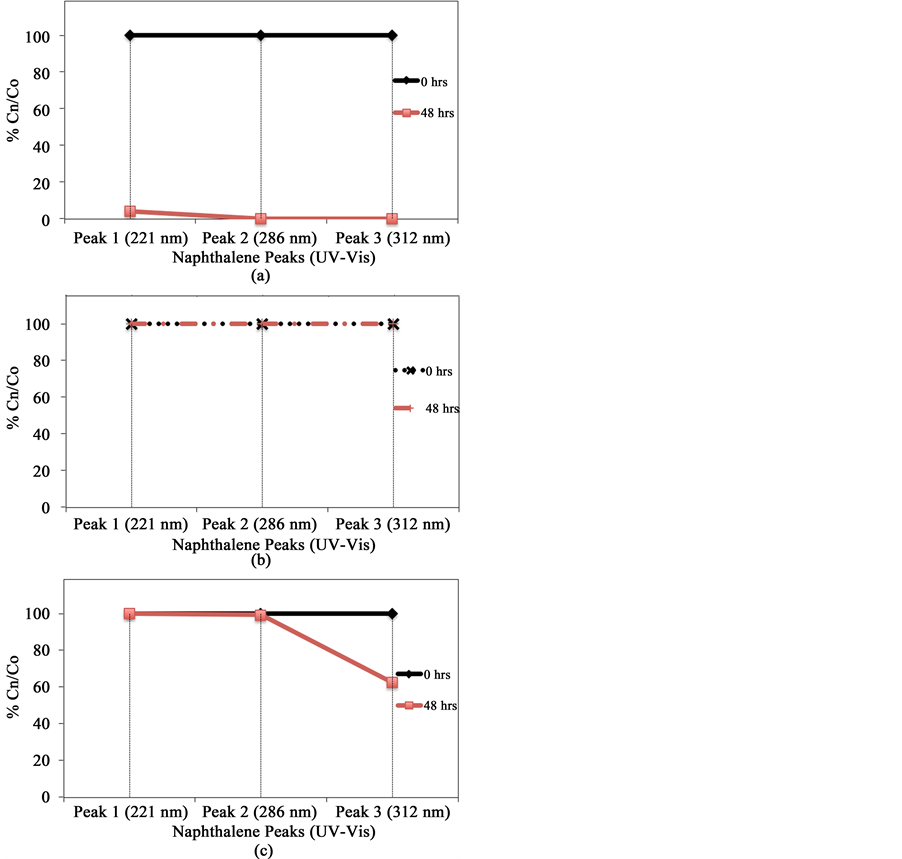 Based on the procedure for MO, the performance of G-TiO2 nanoparticle, G-TiO2 nanocomposite and G-ZnO nanowire were used on naphthalene in water. 30 ppm of naphthalene was used as contaminant in 100 ml of deionised water. 20 mg of sodium dodecyl-sulfonate surfactant was used to enhance the contact of photocatalyst and pollutants.The light intensity of 800 W/m2 generated by 30 watt bulb was used to remediate naphthalene from water. The samples were analyzed using UV-vis spectrum for naphthalene presence in remediated water at 0 and 48 hrs similar to one discussed for MO. The naphthalene has UV-vis absorption at 221 nm, 286 nm and 312 nm. The values at these peaks were considered to determine the percentage (%) of naphthalene in the remediated water samples.