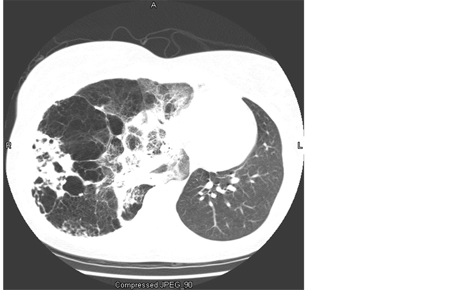 Figure 1. Chest computed tomography demonstrating hyper-inflated, cystic and fibrotic right lung changes.