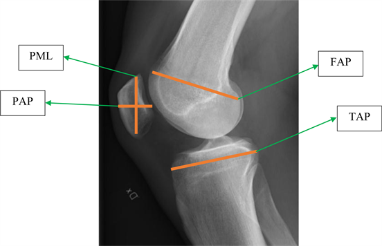 Figure 2. Tibial and patellar dimensions’ X-ray (Femur anterior-posterior (FAP), tibia anterior-posterior (TAP), Patella medial lateral PML, Patella anterior-posterior (PAP)).