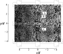 As shown in Figure 5(a) and Figure 6(a), the secondary-flow was observed. In addition, the secondary-flow generates vortices which might be longitudinal vortices. In Figure 5, it was observed that two pairs of the vortices A’ and B were formed in the range of about y/d ≤ ±1.0 and z/d ≤ ±0.5 behind the downstream cylinder, and B was rather small in comparison with A’. The flow around B was entrained into the A’. At the same time, the scale of the vortex pair A in the range of 3.0 ≤ y/d ≤ 4.0 became larger. Similarly, as shown in Figure 6, the scale of vortex pair A’ was smaller, the scale of vortex pair B became larger. At the same time, the scale of vortex pair B’ in the range of −4.0 ≤ y/d ≤ −3.0 became larger. Based on the path lines movie observation, the scale of the vortex pairs (A, A’) and (B, B’) were alternately and periodically varied. The direction of the