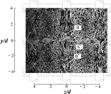 Flow visualization was carried out in a water tunnel which has a cross-section of 400 mm × 400 mm. To take a picture of path lines, nylon particles with an average particle diameter of 50 mm and a specific gravity of 1.03 were mixed into the water flow. The experimental Reynolds number was kept to 200 for flow visualization. The measurement plane was x/d = 2.0.