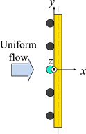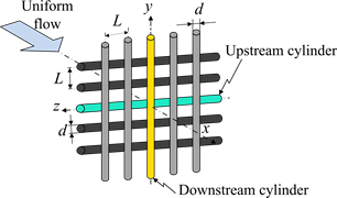 Figure 1 shows the coordinate system and nomenclature. The biplane grid, composed of circular cylinders with diameters of 10 mm, was used for the pressure measurement and flow visualization. The spacing ratio of the cylinders in each row is L/d = 4, where L is distance between adjacent cylinders and d is diameter of circular cylinder.