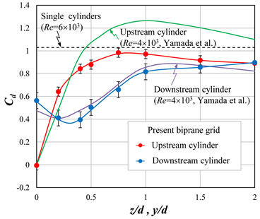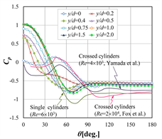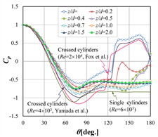 In the case of the upstream cylinders, the value of Cd was rapidly increasing in the range from z/d = 0 to z/d = 0.75 and then gently decreasing in the range from z/d = 0.75 to z/d = 2.0. The former is understood as the influence of the high-speed flow which penetrates behind the upstream cylinder, as mentioned in Figure 2(a). In the case of the downstream cylinder, the value of Cd decreased in the range from y/d = 0 to y/d = 0.4, the value of Cd in the region of y/d ≥ 1.0 was almost constant. The tendency of the distribution is similar to that of the crossed circular cylinders. The value of Cd is thought to be smaller in the range of 0 ≤ y/d ≤ 0.4, since there is no separation point or the separation point moves back, as mentioned in Figure 2(b). In addition, both the value of Cd on the upstream cylinder and the downstream cylinder is lower than the value of Cd on the single cylinder.