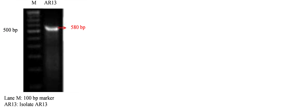 Figure 1. PCR amplification of ITS region of Aspergillus isolate AR13. Lane M: 100 bp marker. AR13: Isolate AR13.