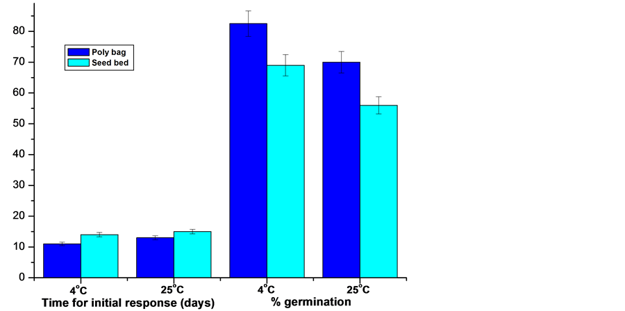 In addition to light conditions, another form of controlling the biological activities is the use of low temperatures. In this experiment, seeds were stored at 4˚C and 25˚C .Seed stratification at lower temperature showed better response than seeds kept at room temperature. Storing the seeds at 4˚C gave slightly higher percentage of viability and germination in comparison to storage at 25˚C. Observations recorded showed that exposure to longer period of stratification has positive effect on the seeds of Berberis manipurana which germinated faster than those stratified for shorter period. Seeds from colder climates and higher altitude germinate quickly at low temperatures than seeds from warmer and lower altitude [25] . This is a characteristic showed by many temperate species; they require cold stratification to germinate [26] .
