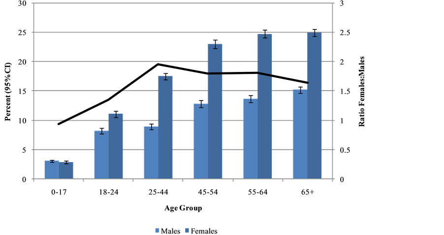 During 2009-2011, 13.3% of males and 21.6% of females had at least one pharmacy claim for antidepressants. The percentage of persons prescribed antidepressant drugs increased with age for both males and females (Figure 1). There was no difference in antidepressant prescription rates between males and females in the age group 0 - 17, but the rates were significantly greater for females in all other age groups, particularly in the age range 25 - 44.