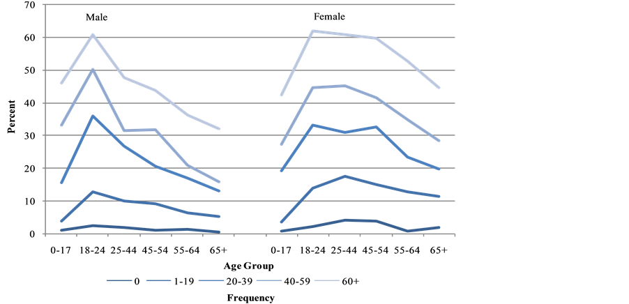 Figure 3. Percent prescribed antidepressants by age, sex, and frequency of prescribed non-antidepressants, 2009-2011.