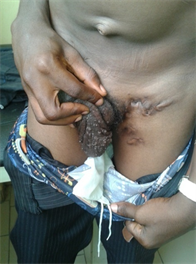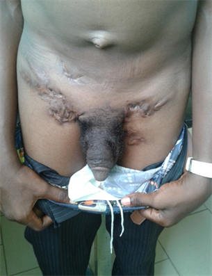 and sinuses were all healed and closed up. Cicatricial tissues were however still present measuring about 5 - 7 cm on affected areas (Figure 8 & Figure 9). Also noticed were clearing of viral warts which responded well to the antiviral drug, Acyclovir (both tablet and cream). The penis was now of normal size and shape (Figure 8).