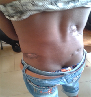 The index patient, a 15-year-old male first presented at ABSUTH on the 5th of November 2015, with a 9 years history of multiple wounds, discharging pus, which was first noticed on the Armpit, then on the legs and thighs. He said the lesions were healing with scar tissues which became multiple with time. The ones on the lower limbs progressively involved the pelvic region, abdomen and the back.