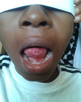 He was not in respiratory distress and chest was clinically clear. The digestive system was normal but for prominent geographical tongue (Figure 4). Inguino-scrotal area showed multiple puckered scars, with florid viral lesions over the penile shaft and scrotum (Figure 1). The scrotum was very firm to touch with discharging sinuses.