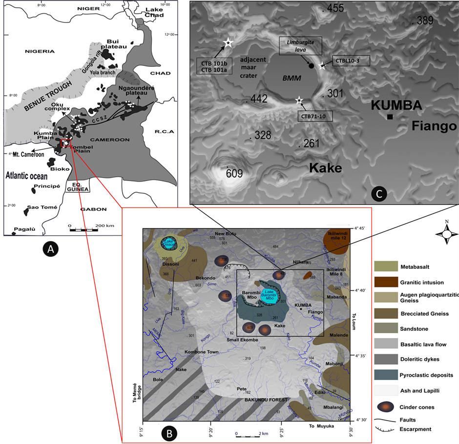 The present findings have implications on the regional volcanism. We observed, for example, that the first eruptive episode (0.513 Ma) occurred at about the same time as the one that put in place the Eboga crater on the Mt Manengouba ~0.56 Ma ago [22] . Also, the second eruptive episode (0.2 Ma) took place during some fissural activities about 0.2 Ma on that same volcano, which is located at ~62 km NE of BMM [22] . It also appears that most of the strombolian activities that produced cinder cones and others small lava flows composing the Tombel graben occurred within the last 0.1 Ma [23] . The graben is the nearest monogenetic volcanic field to the Kumba volcanic field. In addition, [24] suggested that an eruption would have occurred at Mt Cameroon, located ~60 km southwest the BMM, during the same period (~0.1 Ma). These periods of strombolian activities in the Tombel graben and the eruption at the Mt Cameroon would have been also relatively contemporaneous to the final eruptive phase (~0.08 Ma) at the BMM. Those observations suggest that the BMM would have formed during some intense volcanic manifestations of the Cameroon volcanic line. In addition, the youngest age obtained in this study (0.05 ± 0.02 Ma) was from the sample of the Barombi Kotto Maar. We suggest that this may represent