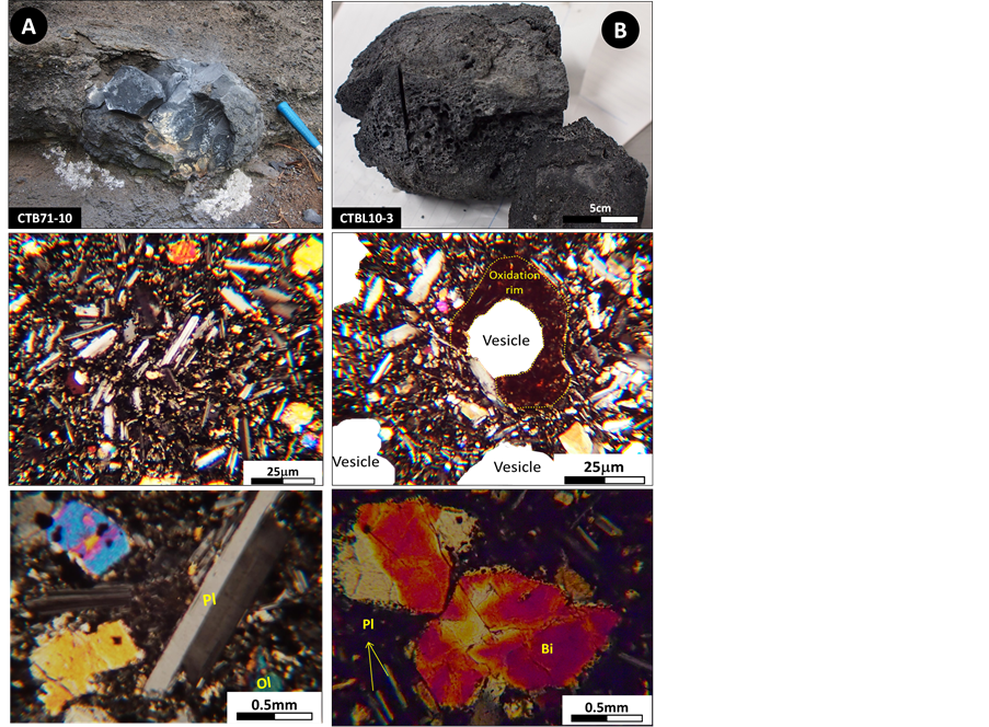 Figure 2. Photographs of the samples CTB71-10 and CTB-L10-3, showing their macroscopic bomb aspect on field. Each sample is shown with its thin sections images below it. It can be observed on the thin sections that the phenocrysts are not altered, confirming the freshness of the samples. Pl: Plagioclase; Bi: Biotite; Ol: Olivine.
