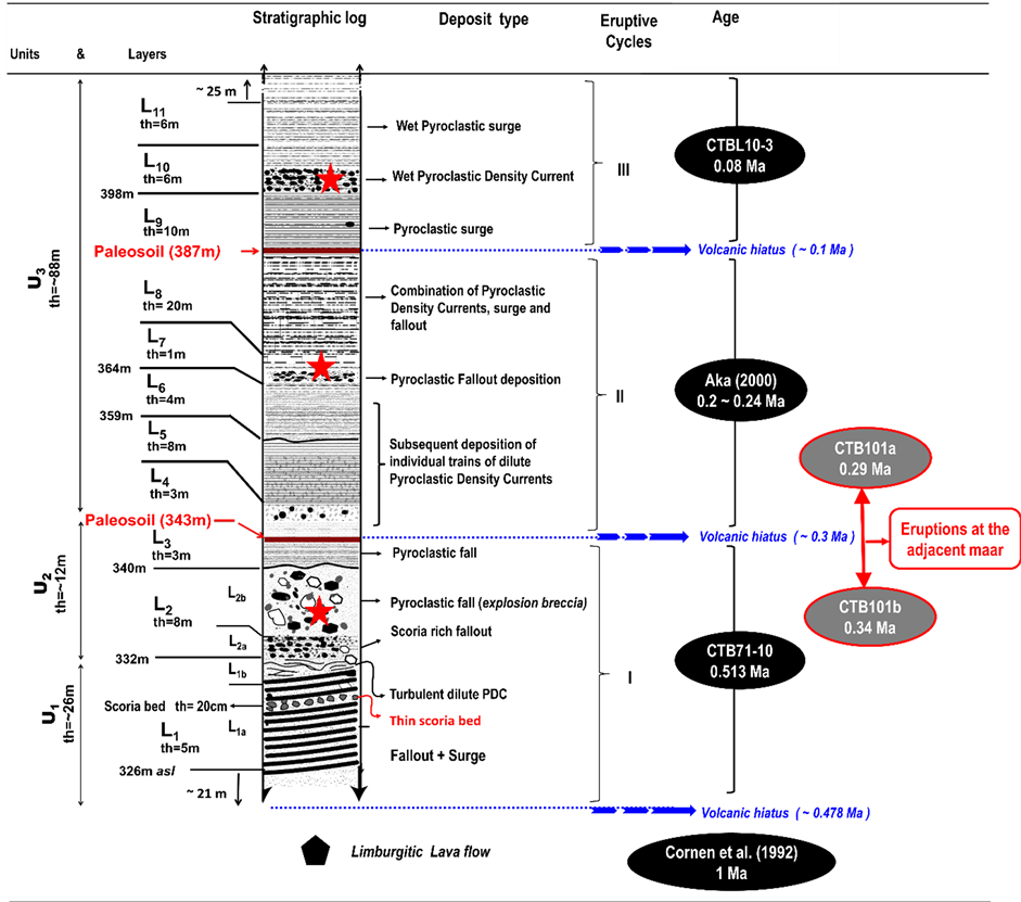 Figure 3. Schematic reconstruction of the chronology of eruptions at the BMM the stratigraphic log is modified after [7] . The red stars in the stratigraphic log represent the positions of the dated samples, and from the bottom to the top, we have sample CTB71-10, Sample from [9] and sample CTBL10-3.