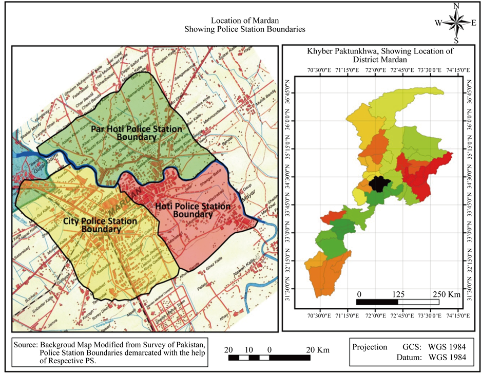 For the present research the data was collected from both Primary and Secondary sources, but it mainly dependent on primary data collected from all the three Police Stations. The data collected includes crimes type, location, and time of occurrence etc. Map of Mardan City was obtained from TMA (Tehsil Municipal Administration) office of Mardan. The boundary of each police station was demarcated with the help of police officers from respective police stations. The image of Mardan was downloaded from Google earth and the area of interest was cropped with help of ARC Map. The image was printed and taken to the field to find various locations were crimes have been reported. Internet, literature and newspapers were also used to get more accurate picture of the respective crimes.