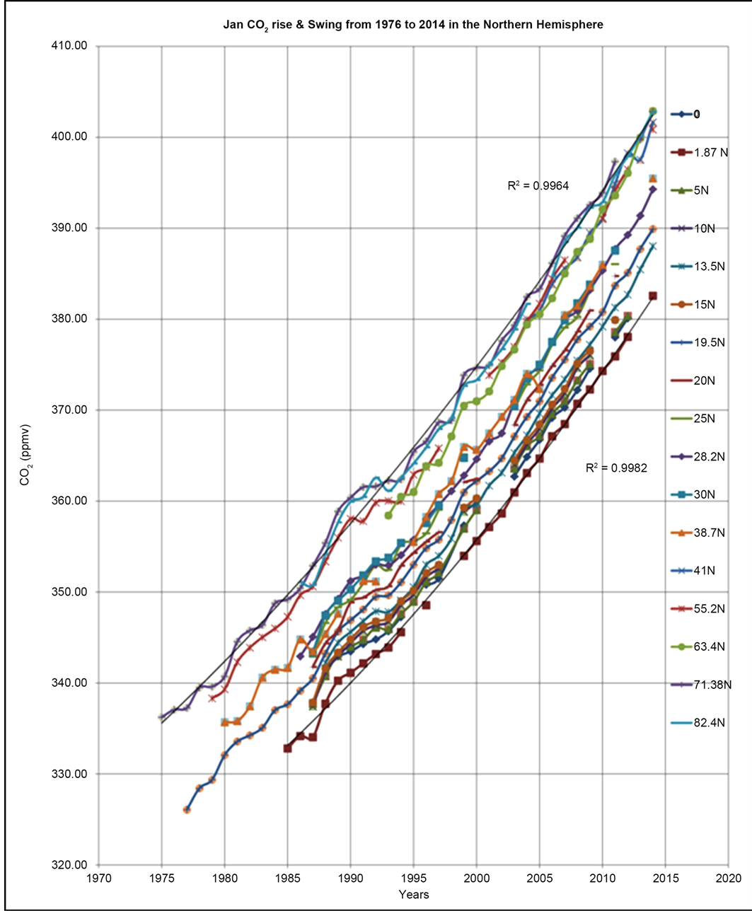 Figure 7. Rise & Swing in January CO2 for Northern Hemisphere between 1976-2014. The dry CO2 data set was from ESRL.