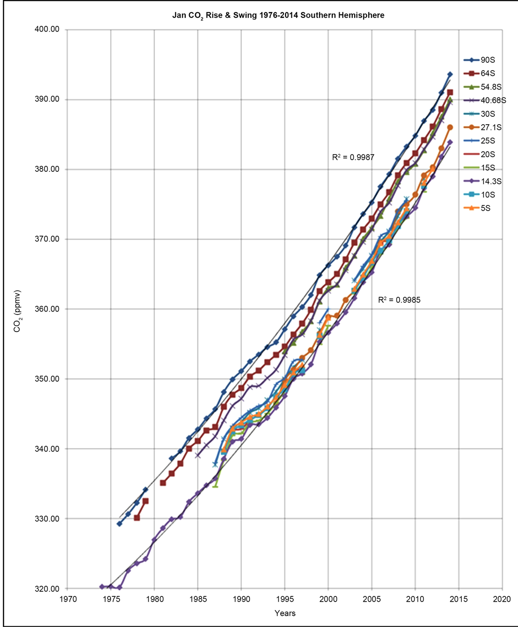 Figure 8. Rise & Swing in January CO2 for Southern Hemisphere between 1976-2014. The dry CO2 data set was from ESRL.