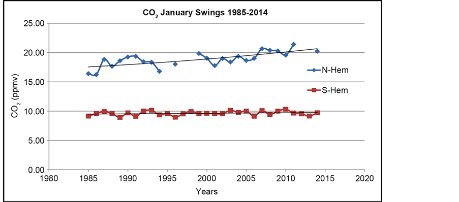 The January swing exhibited ~16 ppmv in 1986 that increased to ~20 ppmv in 2014. The swing increased about 4 ppmv in 28 years or 0.14 ppmv/yr. The swings varied greatly (1 - 20 ppmv) between months in the NH as shown in Figure 5. These swings increased about 17.5% between 1986-2014 as shown in Figure 9. In the SH., the monthly swings were considerably less varied (8.4 - 11 ppmv) as shown in Figure 5, and had a near zero change between years (Figure 9).