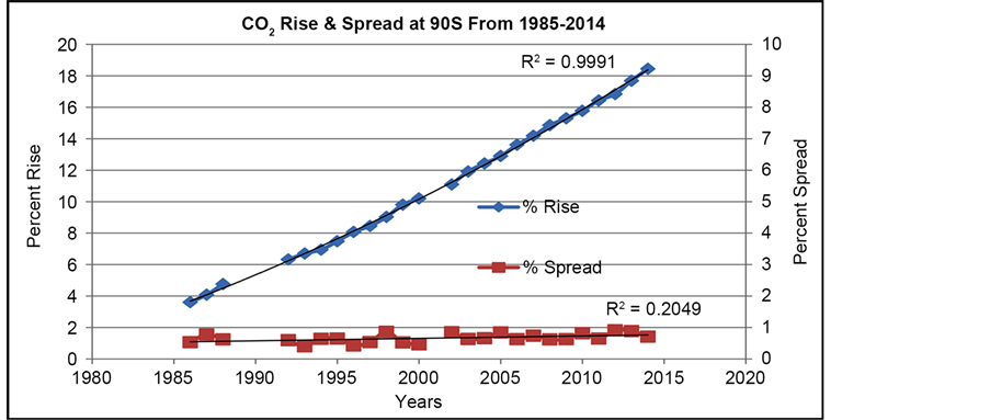 Figure 10. A graph of the percent rise & spread in actual CO2 at the South Pole (−90˚S).