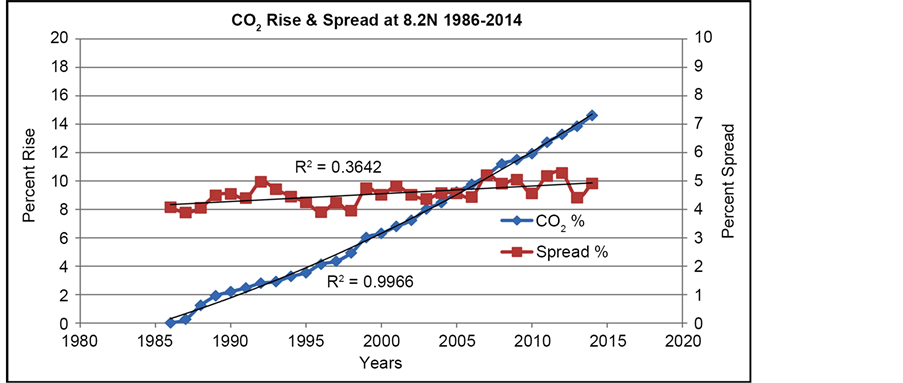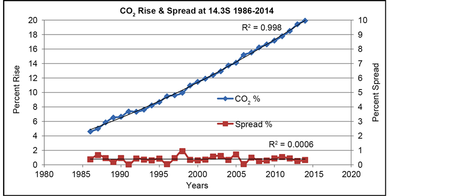 Figure 14. A graph of the percent rise & spread in actual CO2 at Samoa (−14˚S).