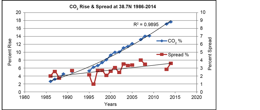 Figure 13. A graph of the percent rise & spread in actual CO2 at Azores (38.7˚N).