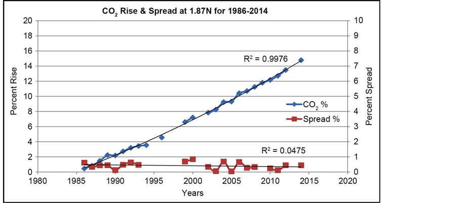 Figure 16. A graph of the percent rise & spread in actual CO2 near the equator at Christmas Island (1.87˚N).