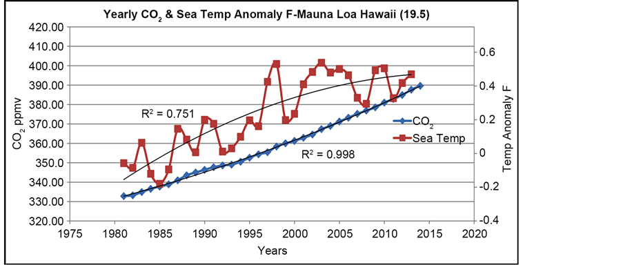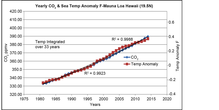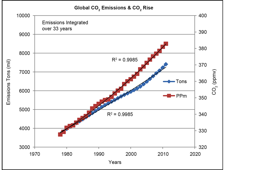 This computation is directed to whether ice formation and snow can cause enough CO2 to be released to effect a change in the atmospheric concentration. The analysis is directed to the NH because that is where the greatest fluctuation occurs. The IPCC [1] reports that 2.14 GtC are contained in each ppmv in the global atmosphere. The following criteria was used in this calculation: 1) the volume in the Troposphere is ~8.4 × 1018 cubic meters; 2) the volume of Troposphere in the Arctic Circle is ~1.4 × 1017 cubic meters; 3) the sea ice surface area change in 2011 was reported to be 6.07 × 1012 square meters; 4) the average ice depth is 3 meters; 5) the average dissolved CO2 in sea water is 52 gm of carbon per cubic meter [24] ; and 6) the average CO2 spread is ~20 ppmv. Based on this information, then the amount of CO2 needed in the Arctic Circle for a 20 ppmv rise would be 0.7116 GtC. The amount released by freezing ice would be about 0.93 GtC. This calculation shows that the ice freezing process “can” provide 30% more CO2 than needed. It is therefore viable.