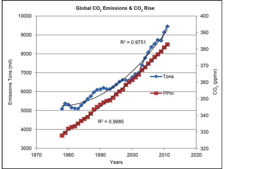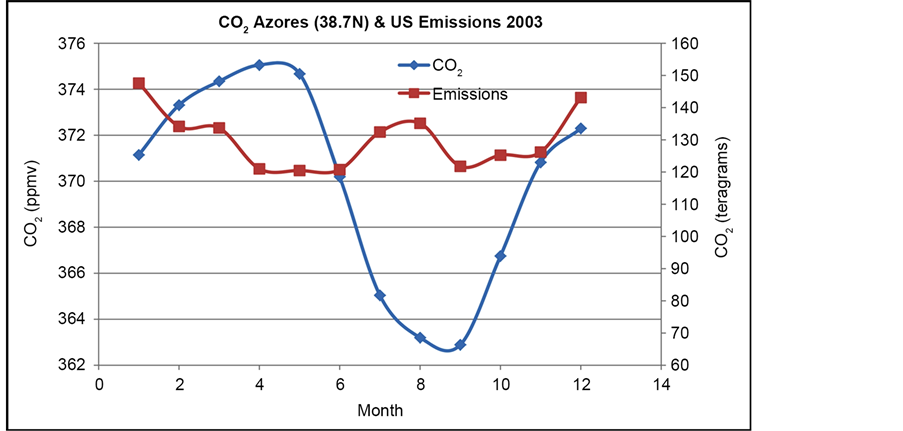 The rise has been the subject of many scientific studies and forms the foundation for the global warming theory. Many believe that the “rise” is caused by burning fossil fuels [1] while others believe that increasing ocean temperatures may be responsible [2] . With respect to spread or seasonal fluctuations, the majority have placed the mechanism on bio-respiration of land plants in the Northern Hemisphere [3] - [6] . These studies point to the Northern Hemisphere because it covers 70% of the earth’s land mass and therefore contains more land plants. Some studies have opined that the rain forests in the Southern Hemisphere (SH) were CO2 neutral, i.e. the absorption of CO2 by the plants was offset by the simultaneous decay of vegetation, thus explaining the lesser fluctuations in the SH.