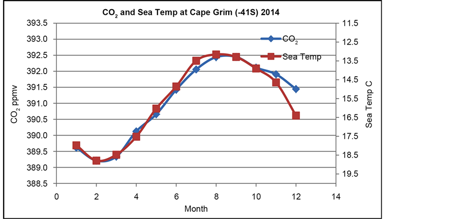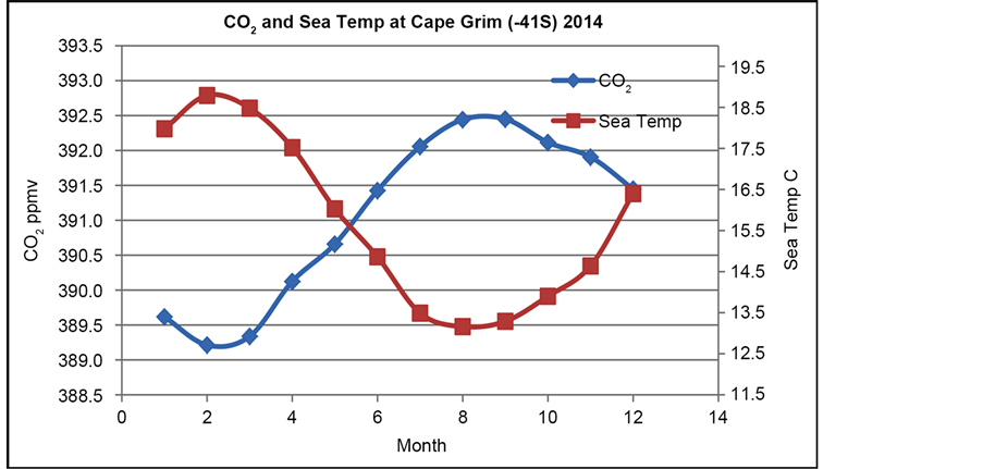 There is a close inverse relationship between seasonal changes in sea temperatures and seasonal changes in the carbon dioxide concentrations. That is, when sea temperatures fall the atmospheric CO2 concentration increases, and when temperatures increase CO2 goes down. The same inverse relationship occurs with air temperature, i.e. a rising temperature and a falling CO2. Some scientists used the inverse land/air temperature relationship as a proxy for a biological connection, i.e. as the temperature goes up, land plants grow and consume CO2 by photosynthesis (sink).