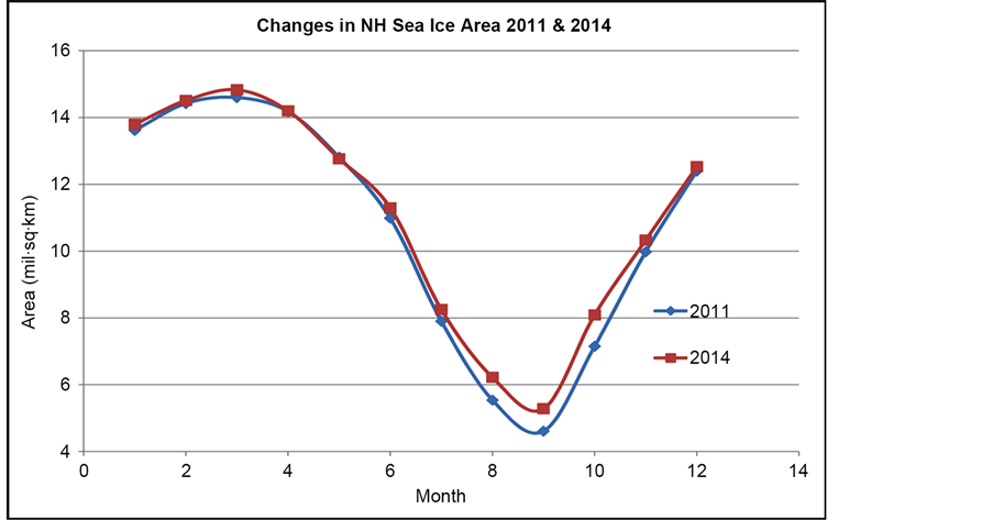 Figure 26. Monthly sea ice area in NH in 2011 and 2014 from NSIDC.