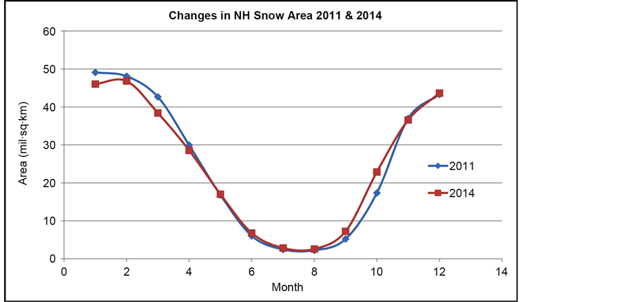 Figure 27. Monthly snow area in NH in 2011 and 2014. Snow data from NSIDC.